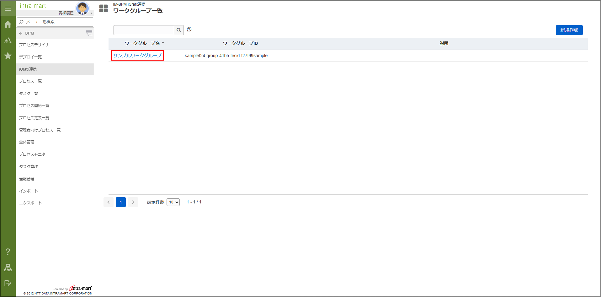 「サイトマップ」→「BPM」→「iGrafx連携」から「ワークグループ一覧」画面を表示します。
