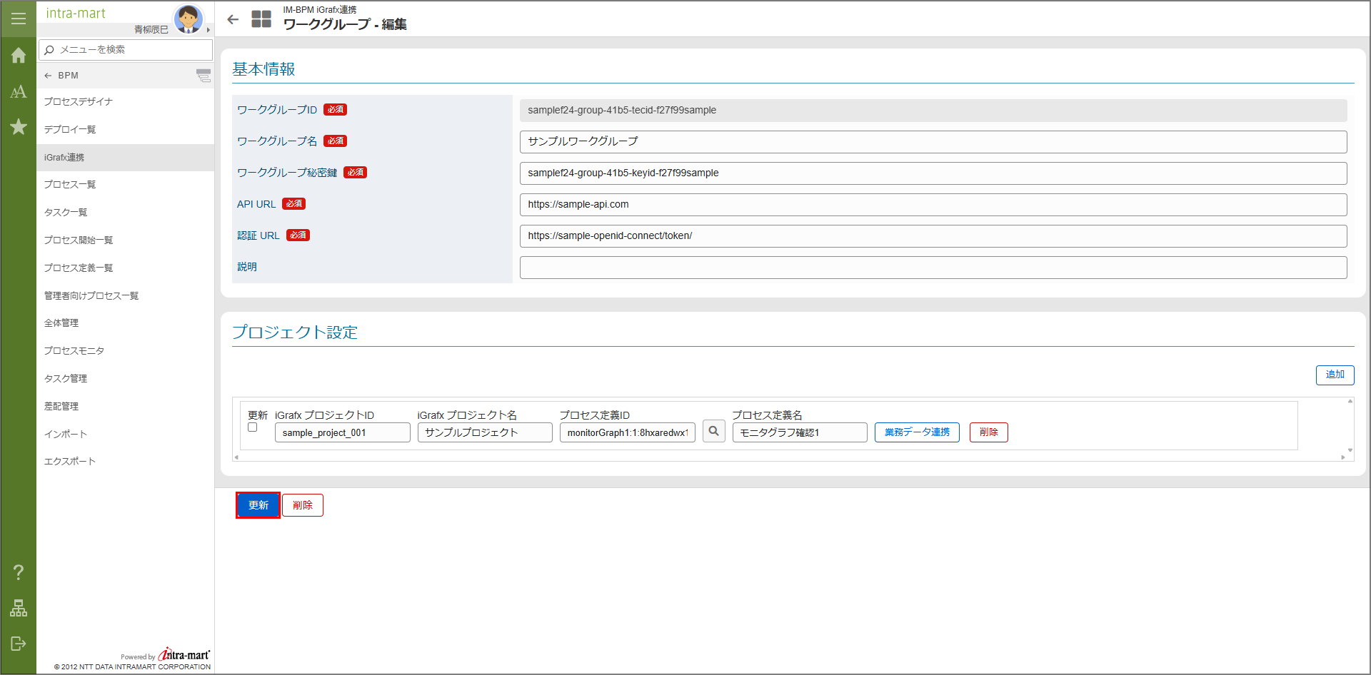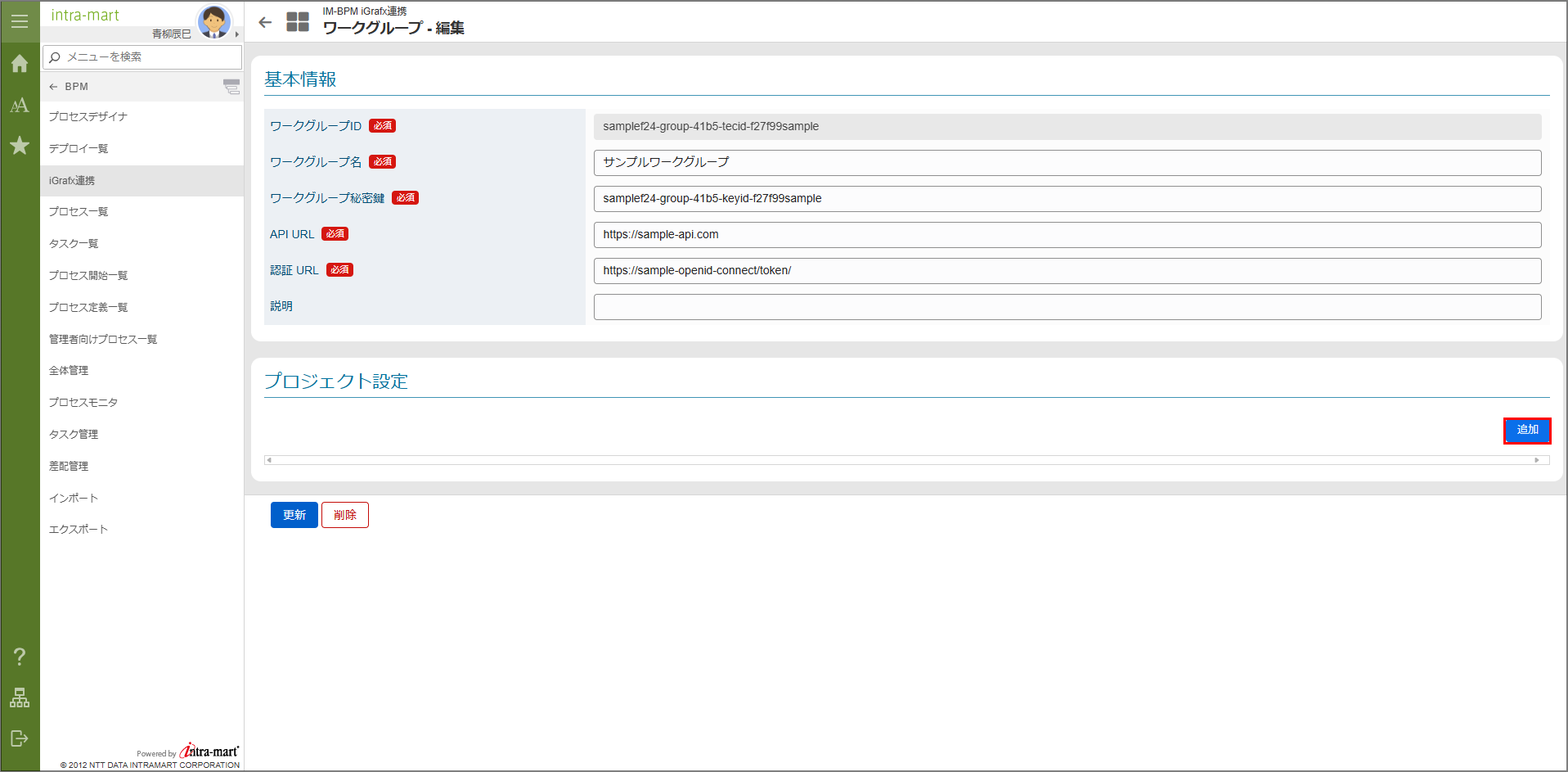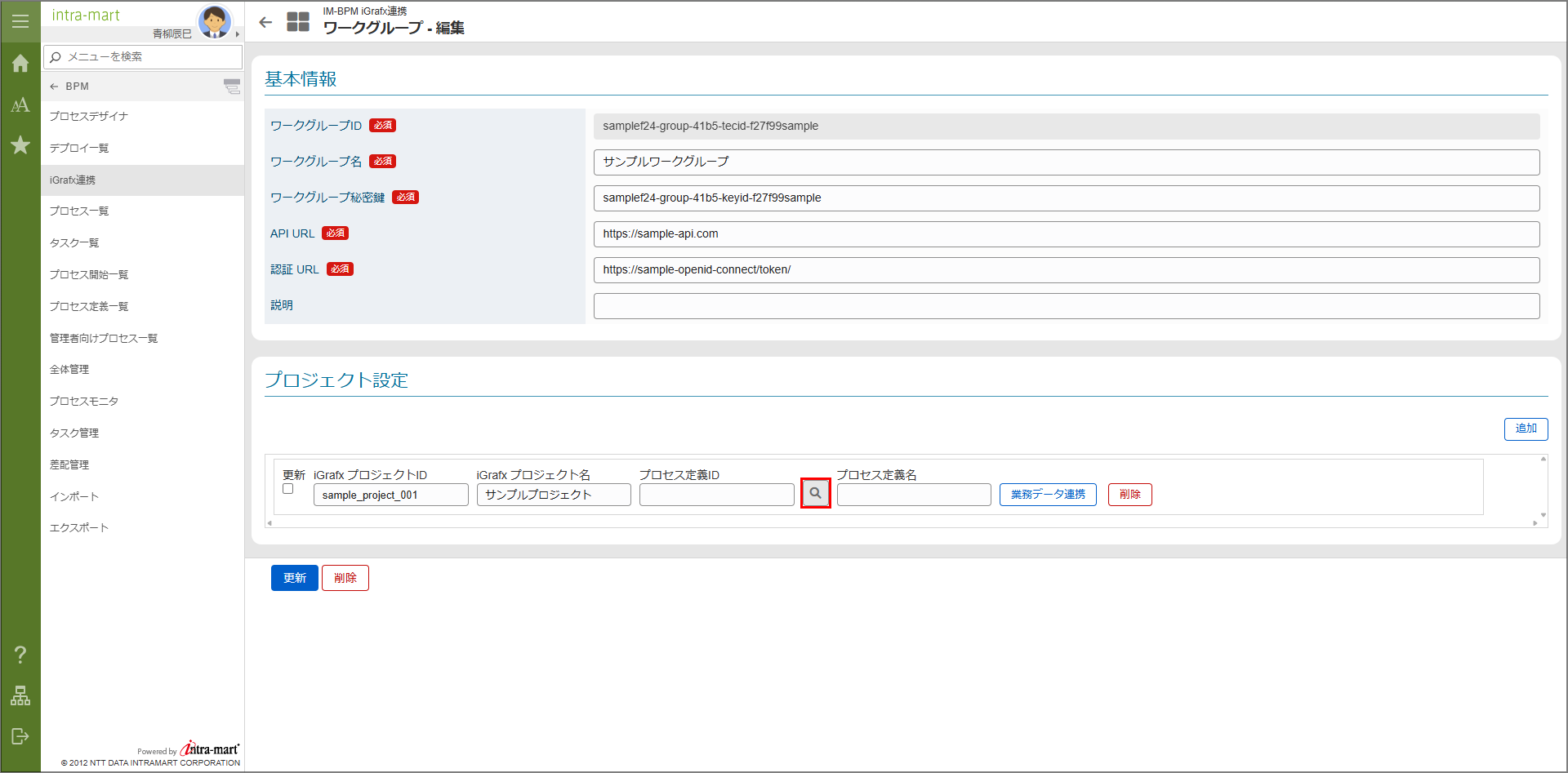- ワークグループのプロジェクト設定では、プロジェクトと連携したいプロセス定義IDを登録します。