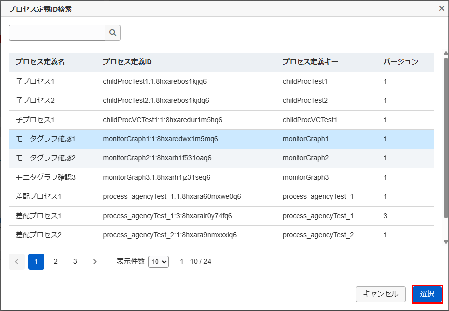 - 「プロセス定義ID検索」画面で、iGrafx側のプロジェクトと連携したいプロセス定義IDを選択して、「選択」ボタンをクリックします。