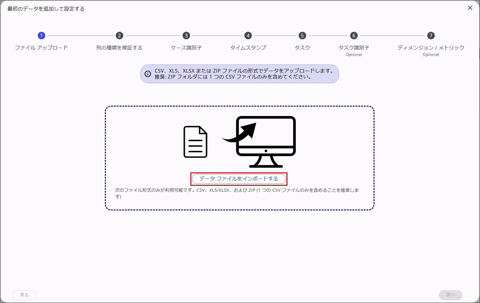 - 「最初のデータを追加して設定する」ダイアログの指示に従って、イベントログをインポートします。