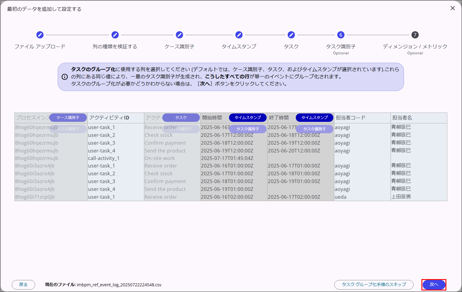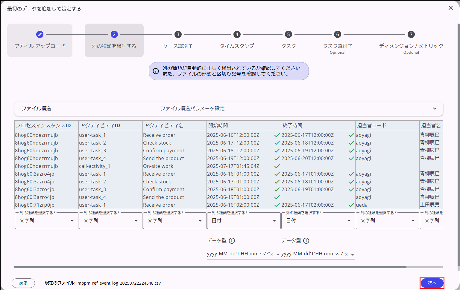 - 列の種類に誤りがないかを検証して「次へ」ボタンをクリックします。