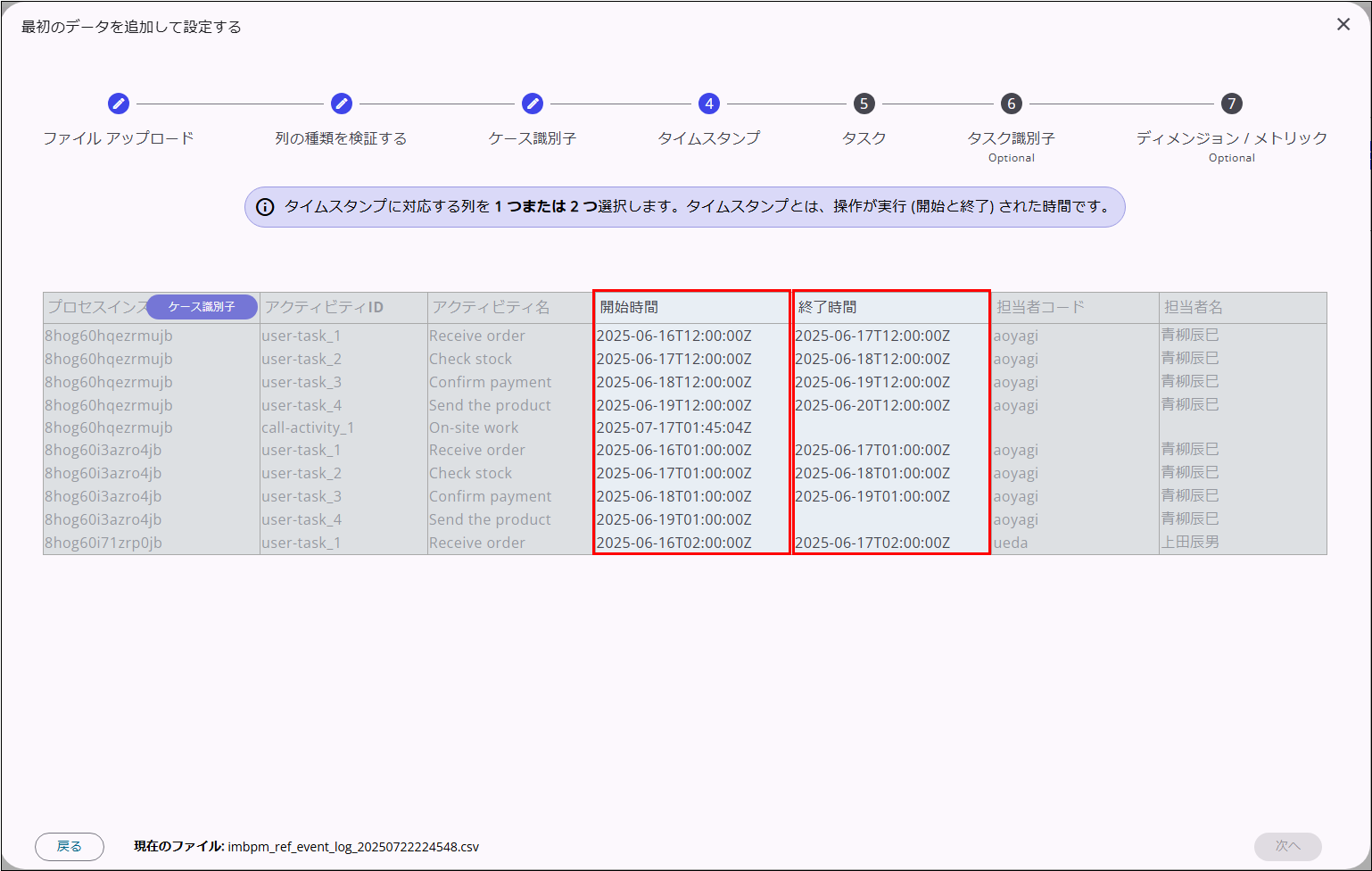 - タイムスタンプに対応する列として「開始時間」と「終了時間」の列をクリックします。