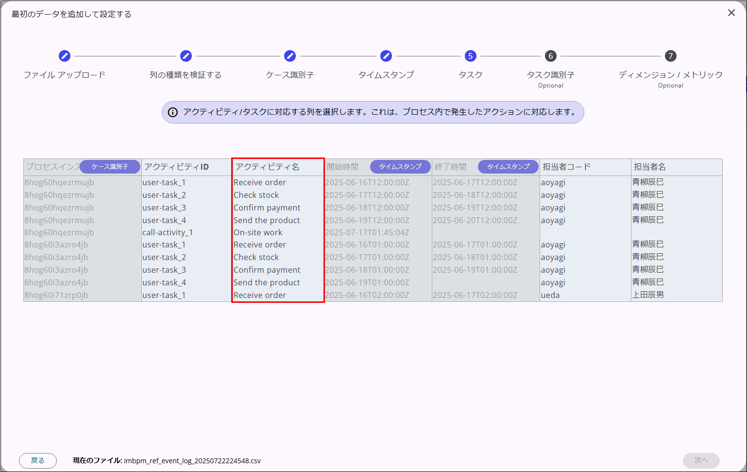 - アクティビティ/タスクに対応する列として「アクティビティ名」の列をクリックします。