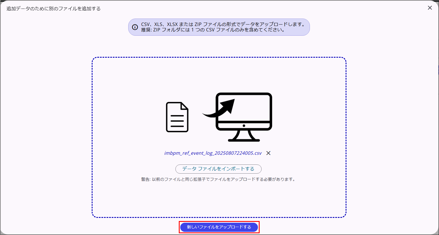 - 「追加データのために別のファイルを追加する」ダイアログの指示に従って、イベントログをインポートします。