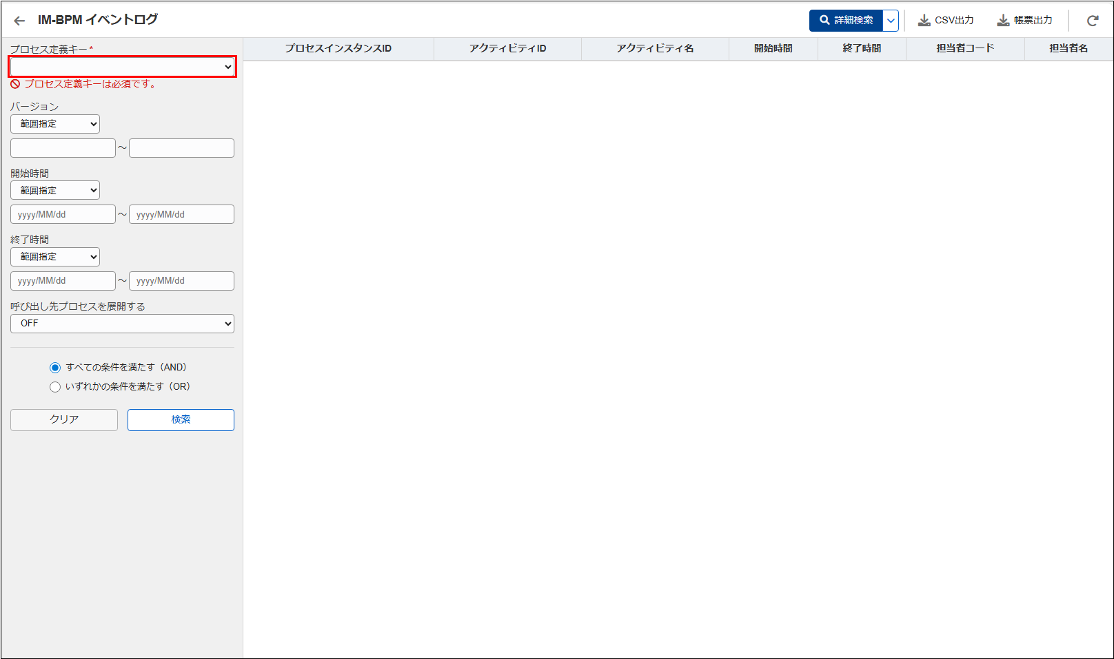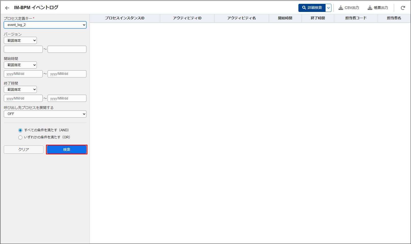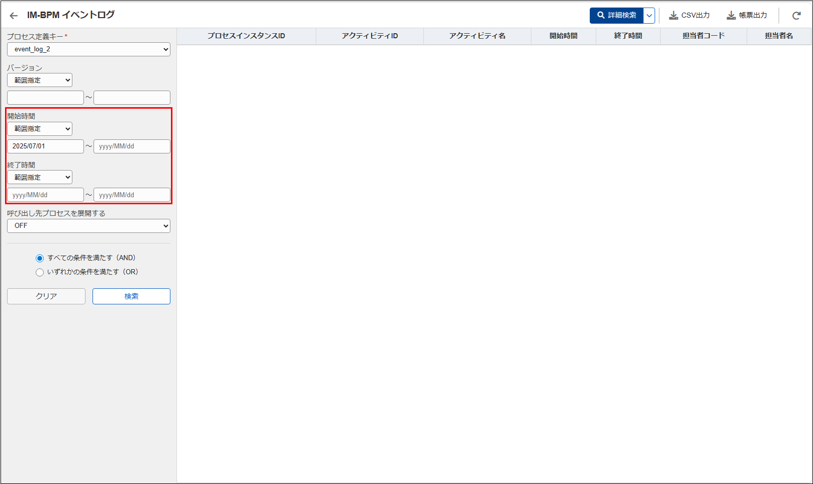 - 「IM-BPM イベントログ」画面の検索条件エリアで、任意の期間を入力します。