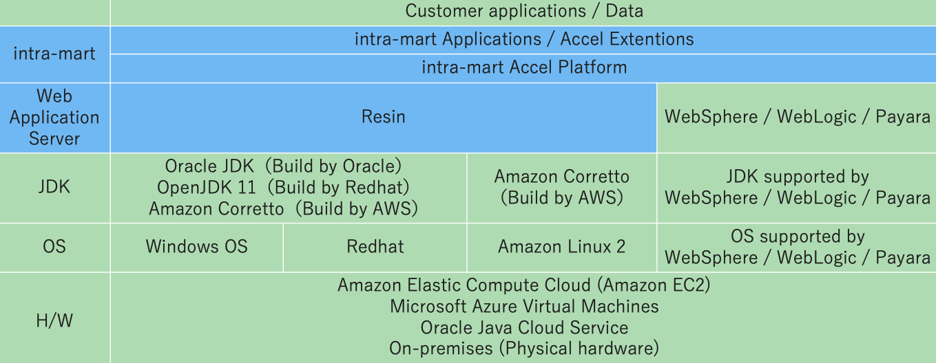 ・製品保守契約上、NTTデータイントラマート社の責任範囲(サポート範囲)・当社製品が下記システムレイヤ記載の縦軸の組み合わせで動作することを保証します。- システムレイヤ(システム階層)