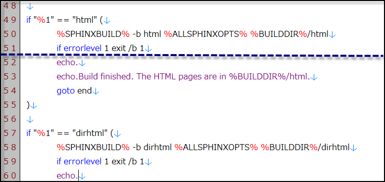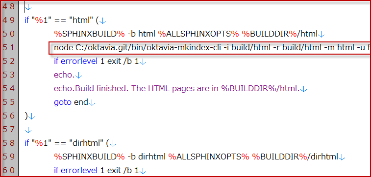 例:intra-mart Accel Platform 一般ユーザガイドC:\user_guide\make.bat L.51とL.52の間(下図の点線)に次のコマンドを追加します。node %oktaviaを展開したディレクトリパス%/bin/oktavia-mkindex-cli -i build/html -r build/html -m html -u file -f .content -c 5 -t web -o build/html/searchindex.js -I