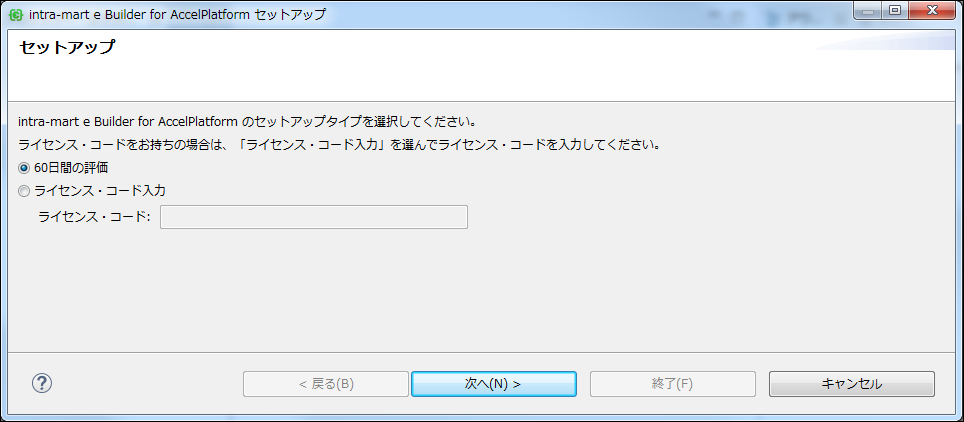 intra-mart e Builder for Accel Platform 2018 Winter 版より、メモリサイズのデフォルト値が変更されています。メモリサイズは、eBuilder8.ini にて以下の様に設定されていますので、ご利用の環境に合わせて変更してください。————————————–(省略)-Xms512m-Xmx4096m(省略)————————————– e Builder の初回起動時に下図のような「セットアップウィザード」画面が表示されます。このウィザード画面で試用版ライセンスを利用するか製品版ライセンスを利用するか選択してください。ライセンスは初回起動時でなくても登録できます。ライセンスをお持ちでない方は評価版を選択してください。評価版は 60 日間有効です。また、この画面で「キャンセル」をクリックすると自動的に e Builder が終了します。