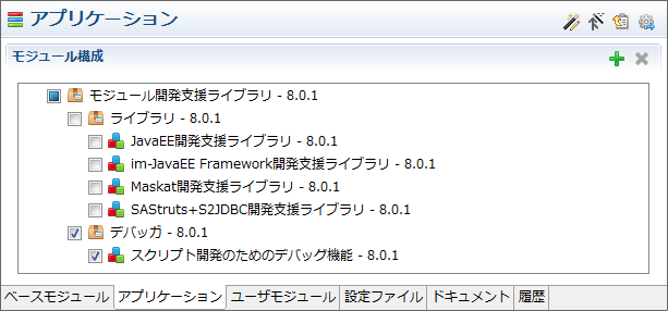 スクリプト開発においてデバッグ機能を利用したい場合は、アプリケーションで「モジュール開発支援ライブラリ」を追加し、「デバッガ」を選択してください。(下記イメージはモジュール開発支援ライブラリの 8.0.1 を設定した場合です)![]()