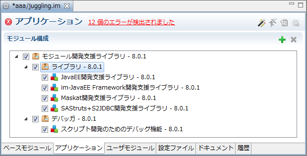 SAStruts Framework を含めて、「結合テスト環境」で war を作成した場合、複数のリクエストを同時に処理できなくなります。 intra-mart WebPlatform Ver.7.2 に同梱されていた im_eb_component.jar を利用していた場合、「ライブラリ」にチェックを入れてください。また、モジュール開発支援ライブラリを設定する際、一部のモジュールには必須となるベースモジュールがあります。その設定が欠落していた場合は IM-Juggling 上でエラーメッセージを表示し、そのベースモジュールが必要となるかを表示します。この指示に従い、ベースモジュールを設定してください。(下記イメージはモジュール開発支援ライブラリの 8.0.1 を設定した場合です)![]()
