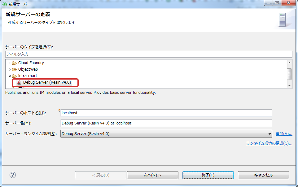 「新規サーバ・ウィザード」から「intra-mart」→「Debug Server(Resin4.0)」を選択します。サーバを起動する場合、Java は JDK を利用するように設定してください。