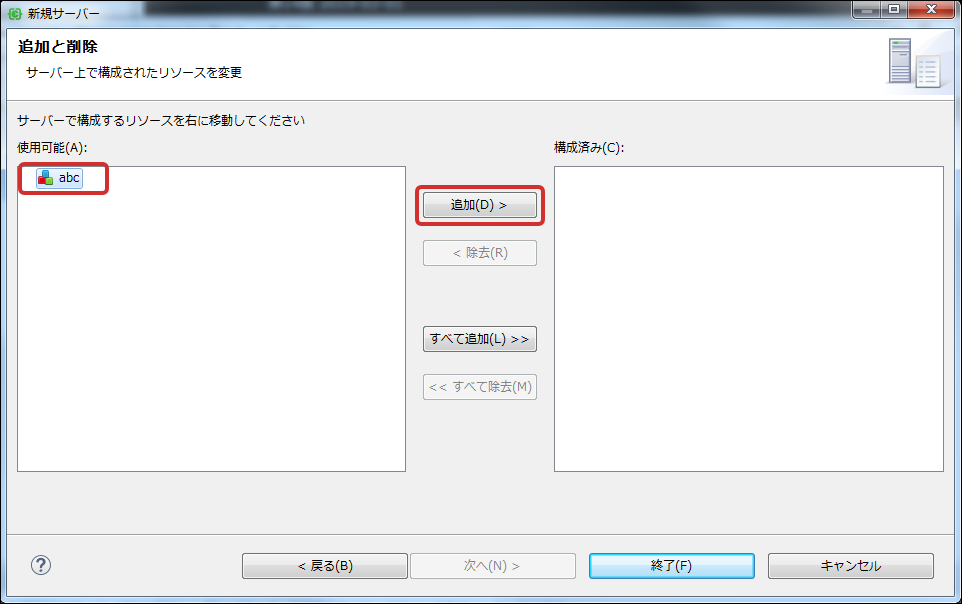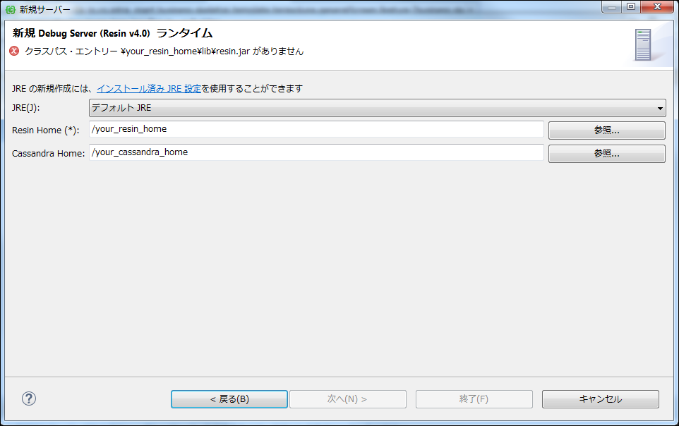 Resin Home に Resin サーバのインストールディレクトリを指定します。Cassandra を使用する場合は Cassandra Home に Cassandra のインストールディレクトリを指定し、次へボタンを押下します。 既にモジュールプロジェクトがある場合、デバッグサーバとの関連付けを行います。モジュールプロジェクトがない場合はそのまま終了ボタンを押下します。「終了」ボタンを押下すると「サーバ」ビュー上に設定した デバッグサーバ の情報が表示されます。