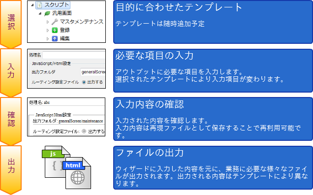 ここでは、業務スケルトンを利用した開発の流れについて説明します。業務スケルトンウィザードの実際の実行方法に関しては、 業務スケルトンの実行 を参照して下さい。業務スケルトンを利用した開発の流れでは、初回に業務スケルトンウィザードを利用し、アプリケーション開発における雛形を生成します。業務スケルトンウィザードを利用するに当たり必要な作業、手順は下記の図を参照下さい。その後、生成された雛形をカスタマイズし、開発目的に沿った形のアプリケーションへと開発を行います。アプリケーション開発中、開発後において雛形(テンプレート)化が可能であるコード、設定が存在する場合は、業務テンプレートを作成し、以降の開発に有用なテンプレートを作成する事をお勧めします。業務テンプレートの作成方法に関しては、 テンプレート作成チュートリアル を参照してください。