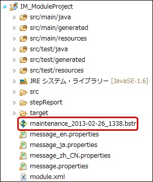 業務テンプレートを共に、業務スケルトンウィザードが生成したファイルはコンソールビューに表示されます。また、生成されたコード、設定を元に変更が必要な部分(実際の業務ロジックの記述が必要になる部分)は、タスクビュー、またはマーカービューを参照する事により確認する事が可能です。![]()