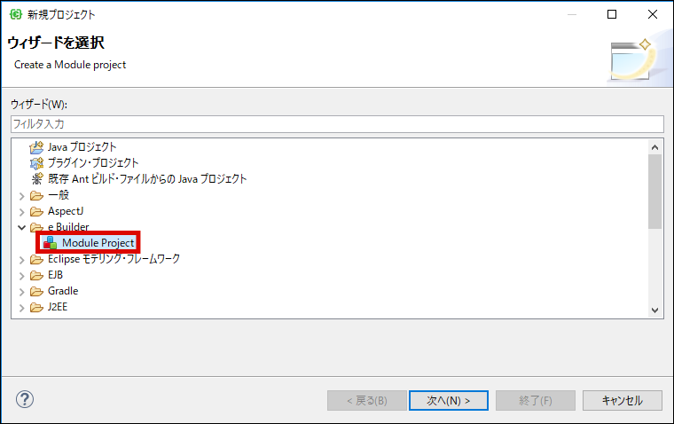 新規プロジェクト作成ウィザードから「 e Builder 」→「 Module Project 」を選択し、「次へ」を押下します。
