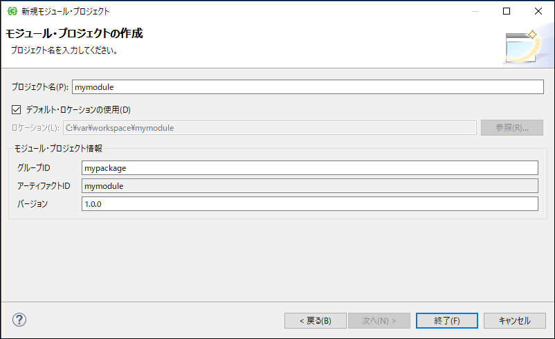 モジュール・プロジェクト作成ウィザードにて、以下の情報を入力し、完了を押下します。