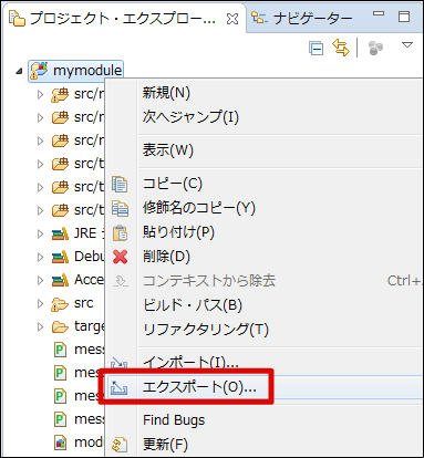 エクスポートを行いたいモジュール・プロジェクトにフォーカスを合わせて右クリックし、「エクスポート」を選択します。