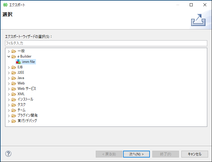 エクスポートウィザードから「 e Builder 」→「 imm file 」を選択し、「次へ」を押下します。