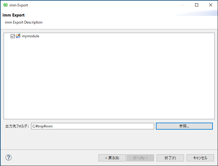 imm ファイルエクスポート画面から、エクスポートするモジュール・プロジェクトとファイルの出力先フォルダを設定し「完了」を押下します。