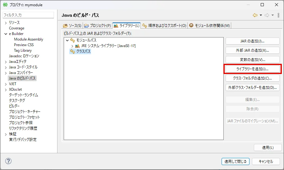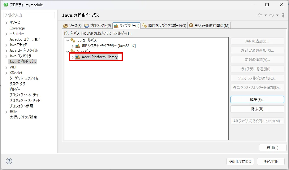 intra-mart e Builder for Accel Platform 2013 Spring 以降、モジュールプロジェクト作成時にサーバ・ランタイムおよび Accel Platform Library がモジュールプロジェクトに自動的に追加されるようになりました。個別にライブラリを設定する必要がある場合のみ、以下手順を参考に設定してください。