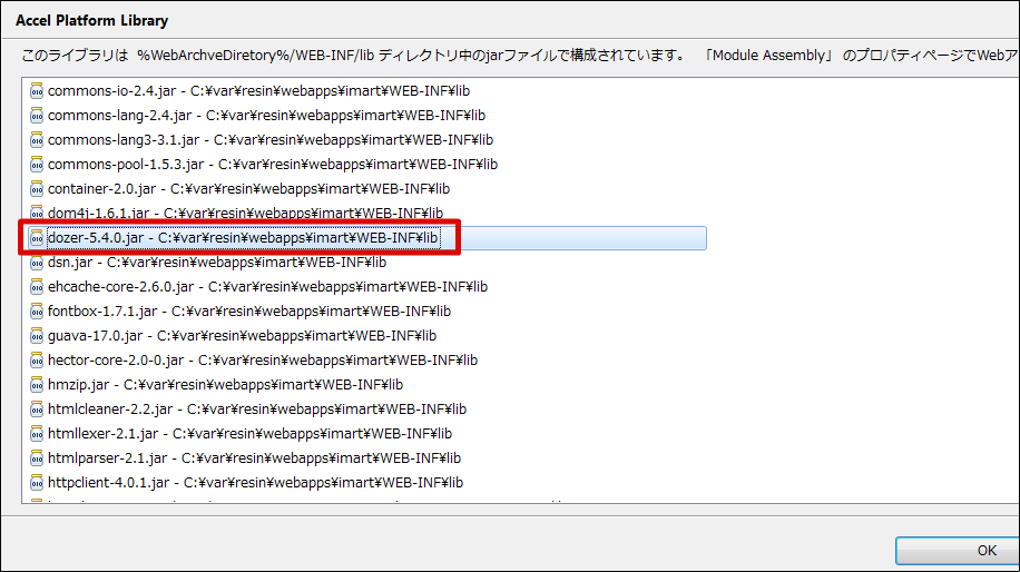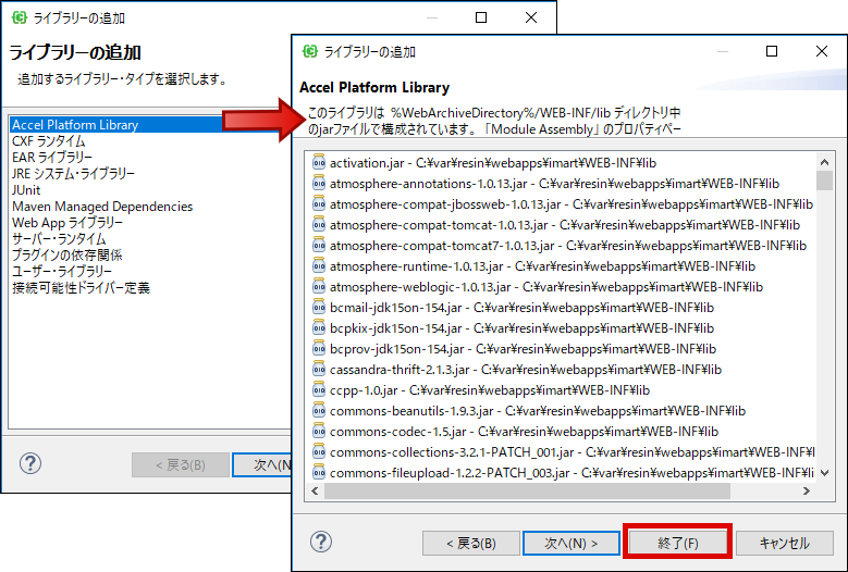 ライブラリの選択で「 Accel Platform Library 」を選択し、追加される jar の一覧を確認して、「 終了 」ボタンを押下します。