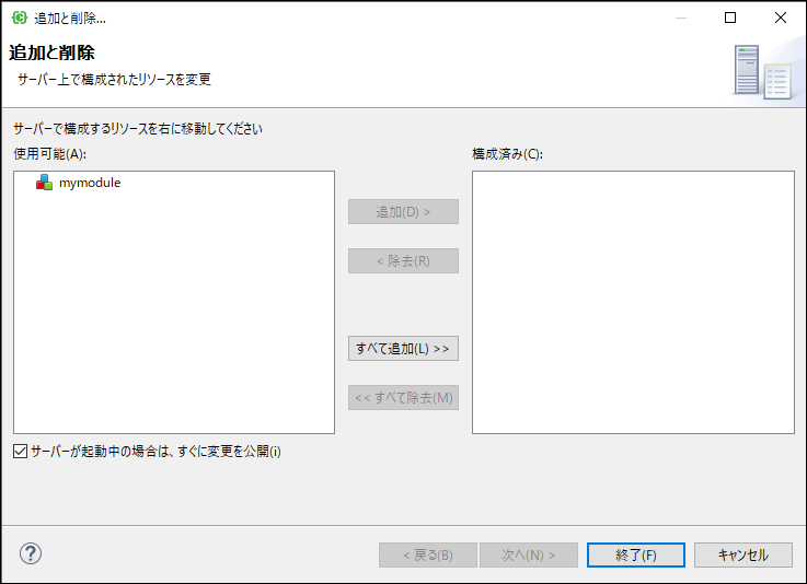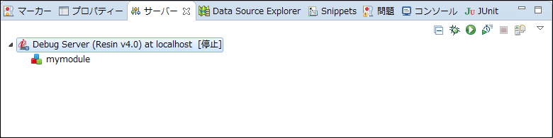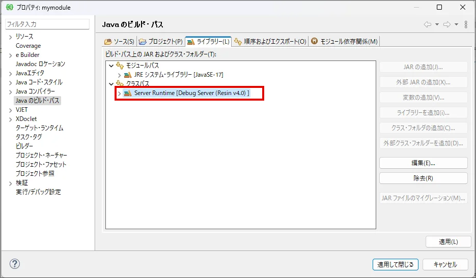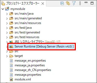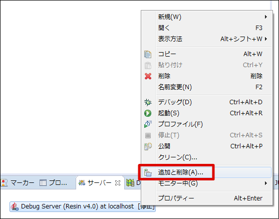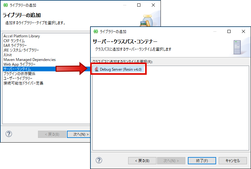 ライブラリの選択で「サーバ・ランタイム」→「Debug Server(Resin v4.0) 」を選択し、「終了」を押下します。