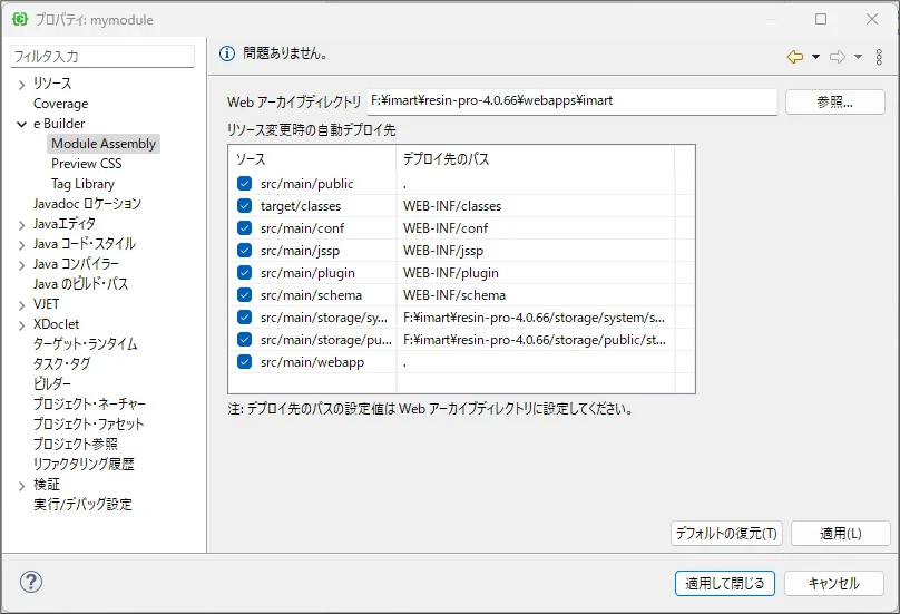 e Builder で作成されたプロジェクトには、ユーザ定義モジュールを作成するために必要な <module.xml> ファイルを配置しています。もしこのファイルがない状態でWebアーカイブディレクトリを設定しようとした場合、 <module.xml> がないとエラーが発生します。下記のリンクには <module.xml>ファイルがなくなった場合の対処方法について記述しています。 サーバとの紐づけを行うことにより、プロジェクトで作成したソースを開発環境用のサーバに自動的にデプロイします。デプロイ元のフォルダとデプロイ先のソースの関連は、「リソース変更時の自動デプロイ先」を参照してください。コラム