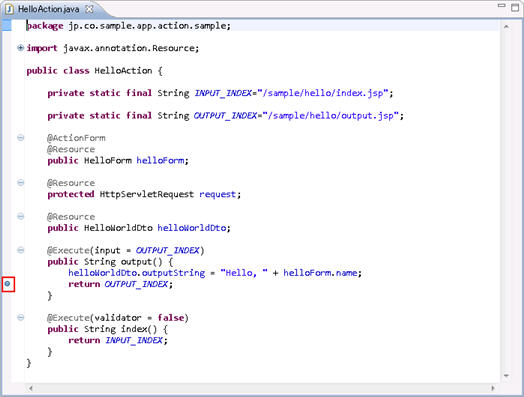 デバッグを行うプロジェクト内の Java ファイルを開いてブレークポイントを設定します。