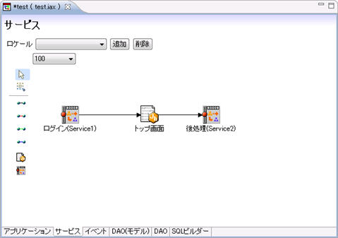 - GUI 画面上にサービスと jsp ページを接続ツールで結んでいき、サービスと jsp ページのマッピングを行っていきます。