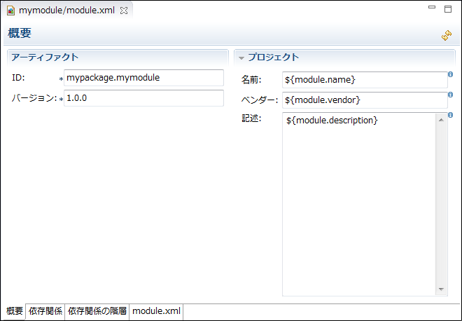 「概要」タブモジュールのモジュールID・バージョンなどの基本情報を表示します。名前・ベンダ・記述はモジュールプロジェクト直下の各ロケールごとのメッセージプロパティファイル上に定義します。注意