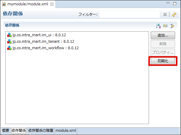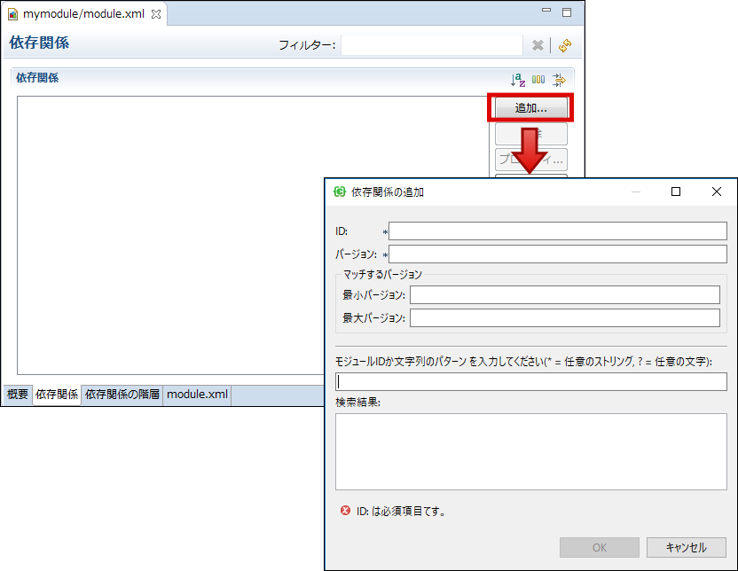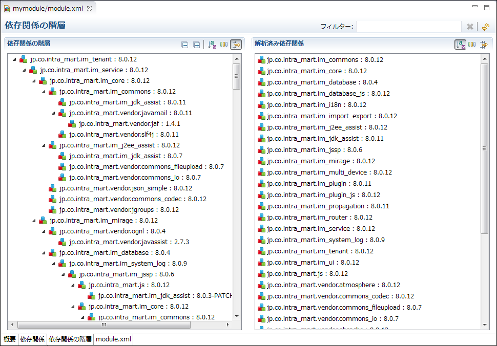 ID(モジュールID)およびショートモジュールIDは、既存モジュールと重複しないようにしてください。既存モジュールのモジュール情報を確認するには、「 WARファイルに含まれるモジュール情報・ショートモジュールIDの一覧を確認する方法」を参照してください。 「依存関係」タブモジュールプロジェクトが依存するモジュールを設定します。 「依存関係の階層」タブ「依存関係」タブで設定したモジュールについて、各モジュールの依存関係を階層構造で表示します。 「module.xml」タブ<module.xml>ファイルをXMLエディタで表示します。