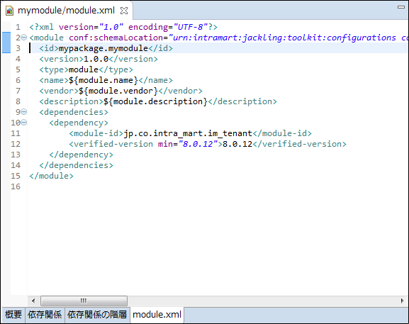 <?xml version="1.0" encoding="UTF-8" standalone="no"?> <module xmlns="urn:intramart:jackling:module" xmlns:conf="urn:intramart:jackling:toolkit:configurations" xmlns:xsi="http://www.w3.org/2001/XMLSchema-instance" conf:schemaLocation="urn:intramart:jackling:toolkit:configurations configurations.xsd" xsi:schemeLocation="urn:intramart:jackling:module module.xsd"> <id>${group_id}.${artifact_id}</id> <version>${version}</version> <type>module</type> <name>${module.name}</name> <vendor>${module.vendor}</vendor> <description>${module.description}</description> <!-- 変更を不可とする場合やサードパーティモジュールの場合のみ以下を指定する --> <tags> <tag>immutable</tag> <tag>3rd-party</tag> </tags> <dependencies> <dependency> </dependency> </dependencies> </module>以下の文字列を、プロジェクト作成時に入力した内容に合わせて記述を行ってください。