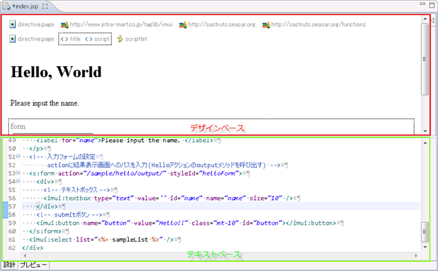 JSP の画面設計をデザインベース、およびテキストベースで編集します。