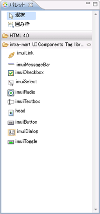 「パレット」ビューを表示することによって利用できます。intra-mart Accel Platform で利用可能な HTML タグをパレットから提供します。パレットから利用したいアイテムを選択し、ドラッグ&ドロップでアイテムを配置できます。プレビュー機能