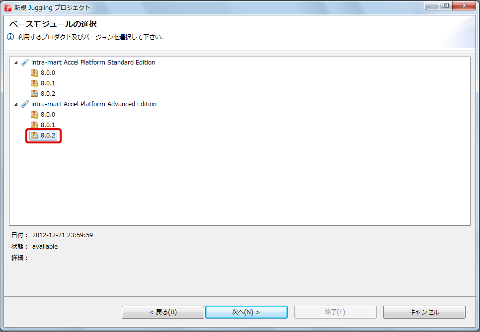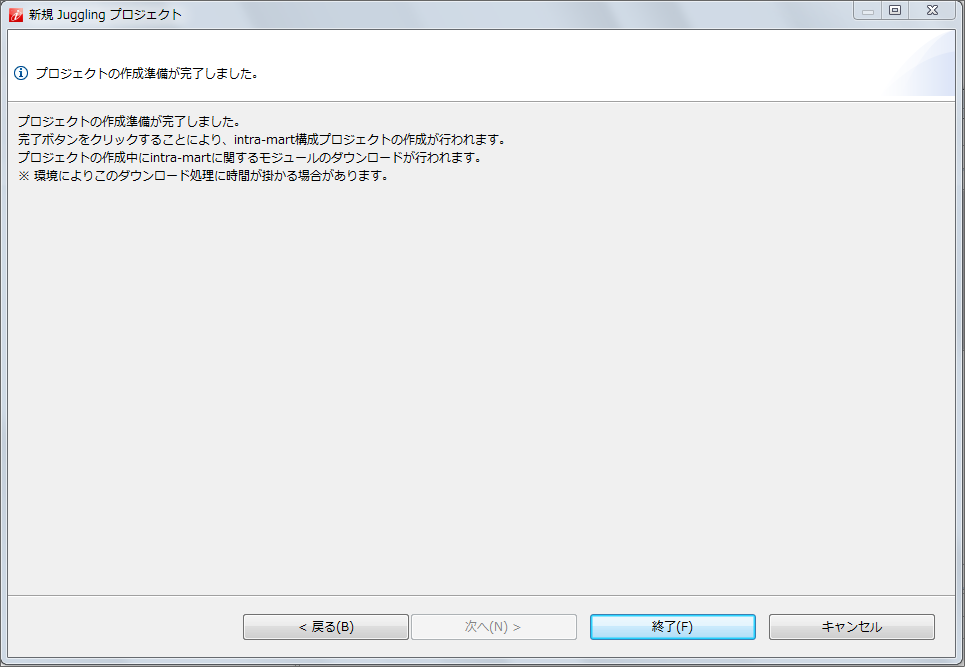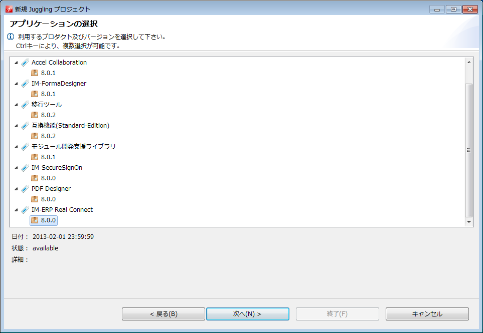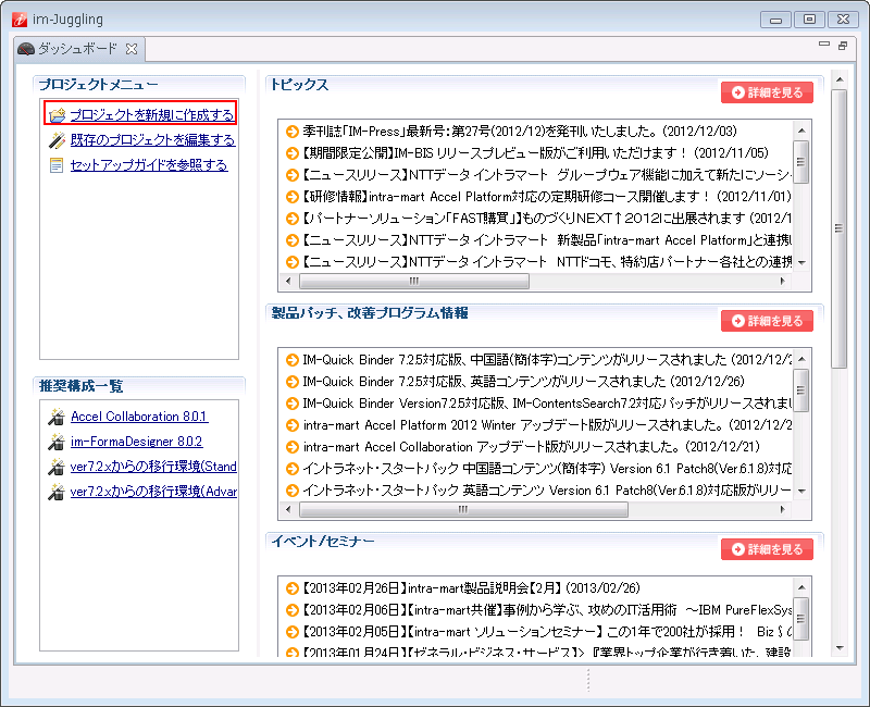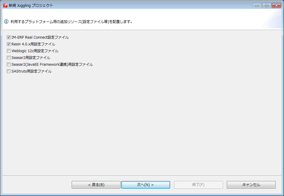 ダッシュボードが表示されます。「プロジェクトを新規に作成する」を選択します。 ポップアップ表示されたウィザード画面内の「プロジェクト名」に半角英数字の任意のプロジェクト名を入力します。入力後、「次へ(N)」 をクリックします。 利用するプロダクト及びバージョンを選択します。選択後、「次へ(N)」をクリックします。 利用するアプリケーションを選択します。選択後、「次へ(N)」をクリックします。 利用するプラットフォーム用の追加リソース(設定ファイル等)を選択します。IM-ERP Real Connect for Accel Platformを利用するために、ERP Real Connect設定ファイルのチェックをONにしてください。選択後、「次へ(N)」をクリックします。最後に「終了(F)」をクリックします。
