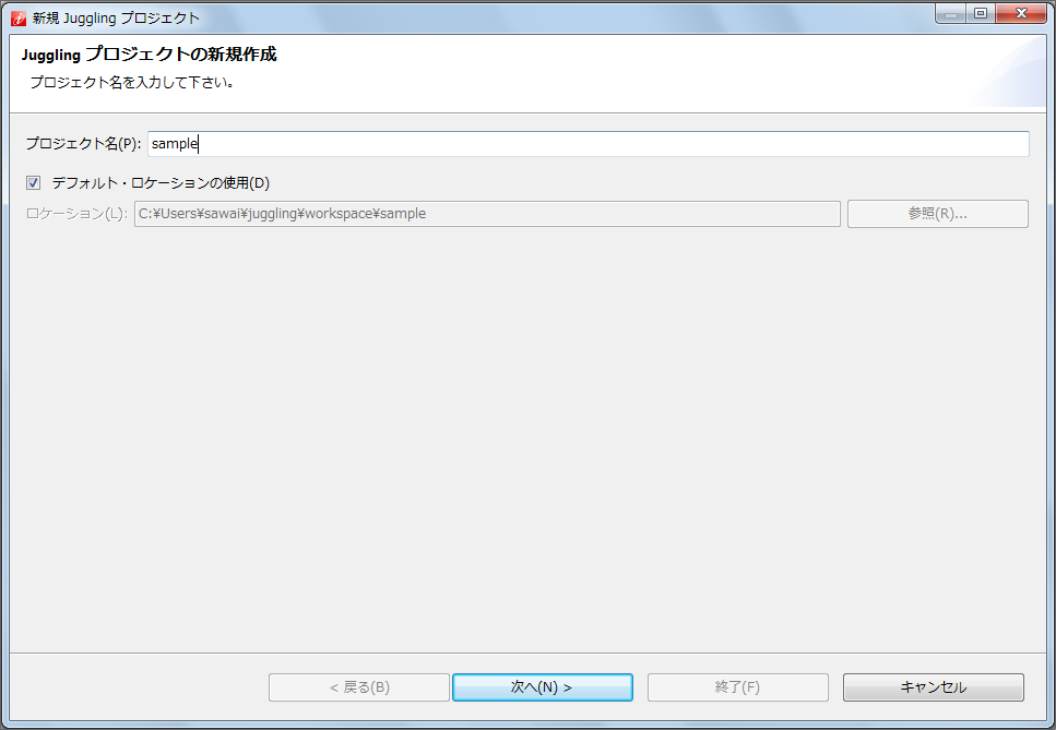 展開したディレクトリ直下にある、 juggling.exe を起動します。