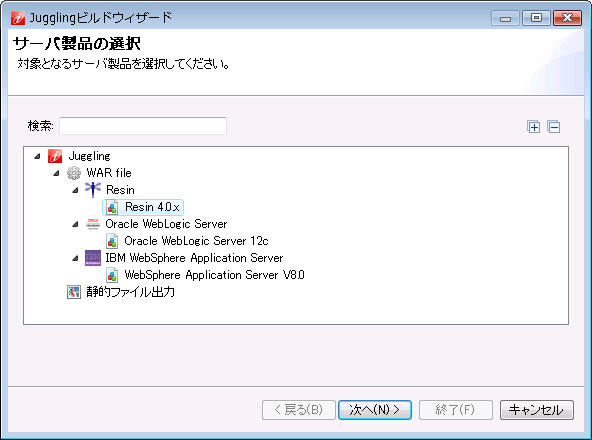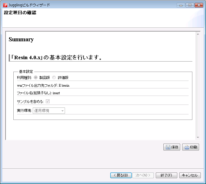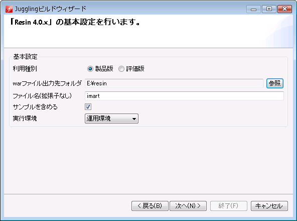 「ライセンスのレビュー」画面で内容を確認し、同意頂ける場合は「使用条件の条項に同意します。」を選択し、「終了」をクリックします。 「設定項目の確認」画面で内容を確認し、「終了」をクリックします。Jugglingビルドウィザード画面が立ち上がり、ダウンロードが開始されます。ダウンロードに時間がかかりますので、完了するまで操作を行わないでください。 warファイルが指定の場所に出力されると、ビルドウィザード画面が閉じます。指定したディレクトリにwarファイルが出力されます。IM-Juggling を終了してください。