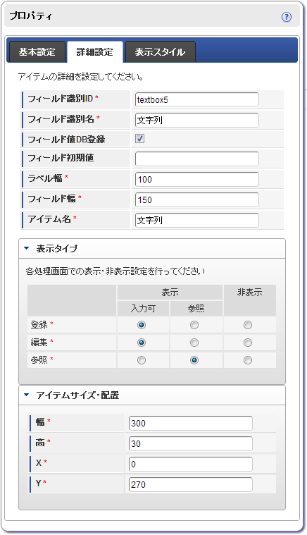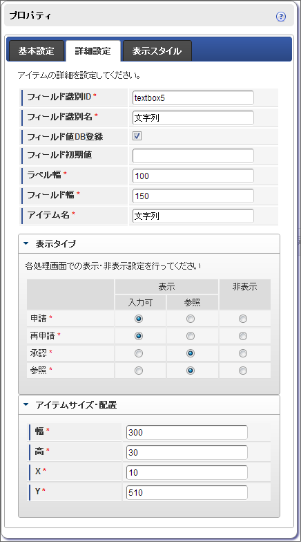 - 画面アイテムの表示名です。ワークフローの追記設定などで使用されます。