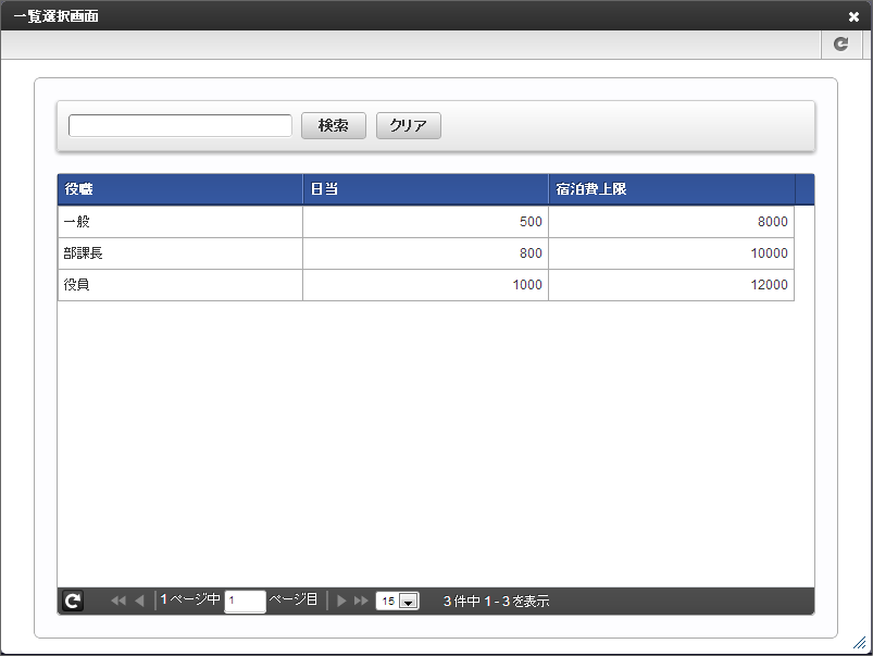 入力チェックでエラーが発生した場合は、下図のように、入力フィールドに対してエラーがわかり易いように枠の色の変更と、エラーのアイコンを表示するようにしています。画面アイテム「数値」では、プロパティを設定することで、フィールドがフォーカスされたときとフォーカスが外れたときに以下のような処理が可能です。画面アイテム「一覧選択」では、アイコンがクリックされたときに以下のように一覧画面を表示します。このように、画面アイテムのUIと振舞いを決めます。