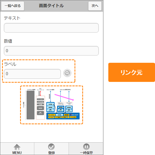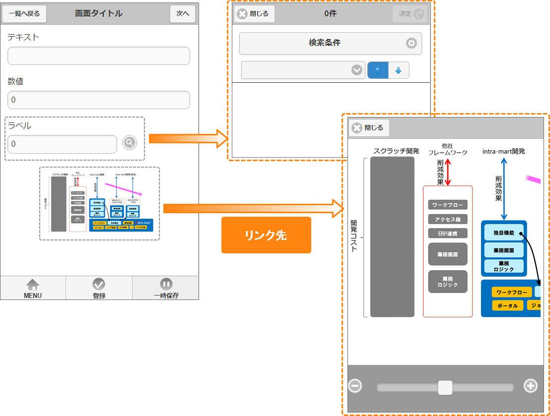 ここでは、リンク機能のある画面アイテムの実装方法について説明します。リンク機能では、メインページ(コンテンツエリア)に配置された画面アイテムから別画面を表示します。