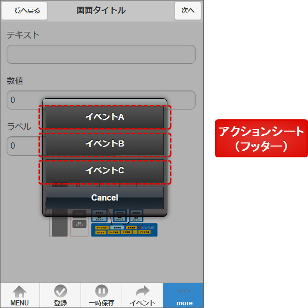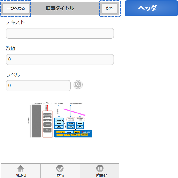 ここでは、ヘッダー・フッターに配置する画面アイテムの実装方法について説明します。ヘッダー・フッターに配置する画面アイテムは、基本的にはボタン用途を想定しています。