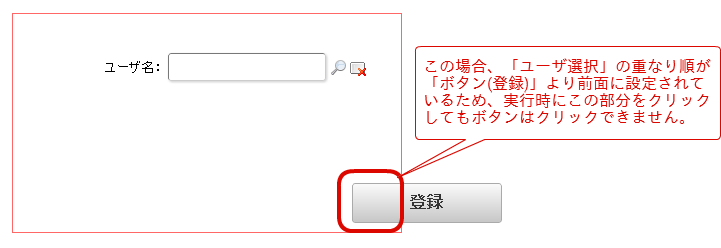 画面アイテムのボタンやチェックボックスなど、クリックで値を変更、処理を実行できる画面アイテムの場合には、他の画面アイテムの範囲(「フォーム・デザイナ」画面上で選択すると赤の点線で囲まれる領域)と重ねて配置しないでください。他の画面アイテムの範囲を重ねて配置した場合には、アプリケーションを実行した場合にボタンやチェックボックスなどをクリックしても何も起こらなくなる可能性があります。画面アイテムのボタンやチェックボックスが、フォーム上の他の画面アイテムと重なってアプリケーションの実行時に操作できない場合には、「フォーム・デザイナ」画面でチェックボックスやボタンの重なり順を最前面にしていただくか、画面アイテムの範囲が重ならない形での配置に変更してください。