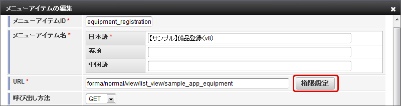 「認可設定管理者」ロールを付与されたユーザがIM-FormaDesigner for Accel Platformのアプリケーションのメニュー設定から「メニューアイテムの編集」画面を表示した場合のみ「権限設定」ボタンが表示されますが、クリックするとエラーが発生しますので、クリックしないようにしてください。 なお、「認可設定管理者」ロールを付与していないユーザの場合には「権限設定」ボタンは表示されませんので、当事象は発生しません。 「認可設定管理者」ロールを付与されたユーザの場合 「認可設定管理者」ロールを付与されていないユーザの場合