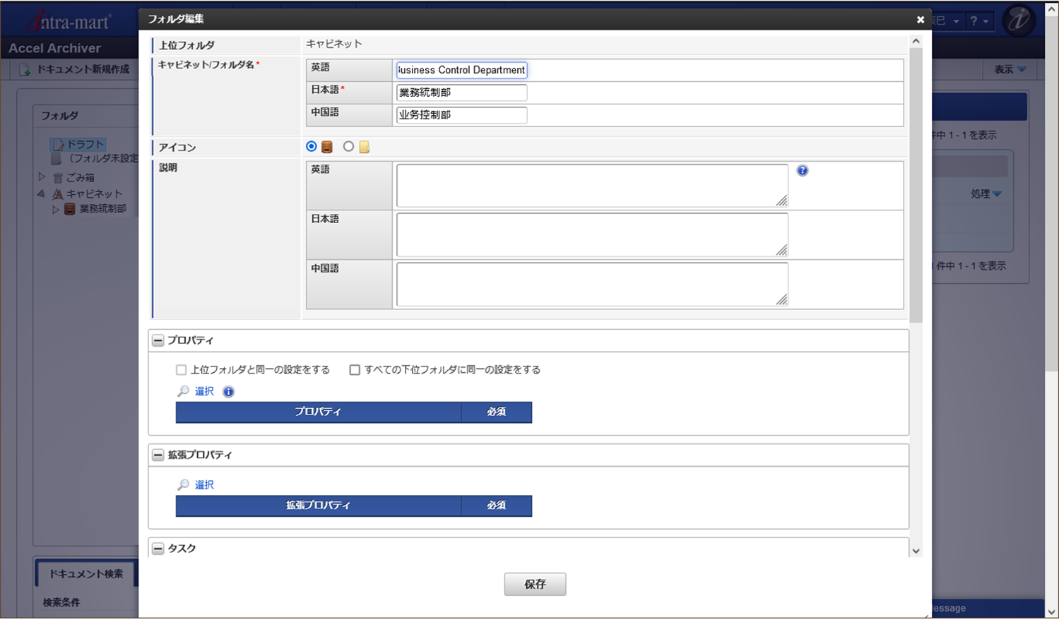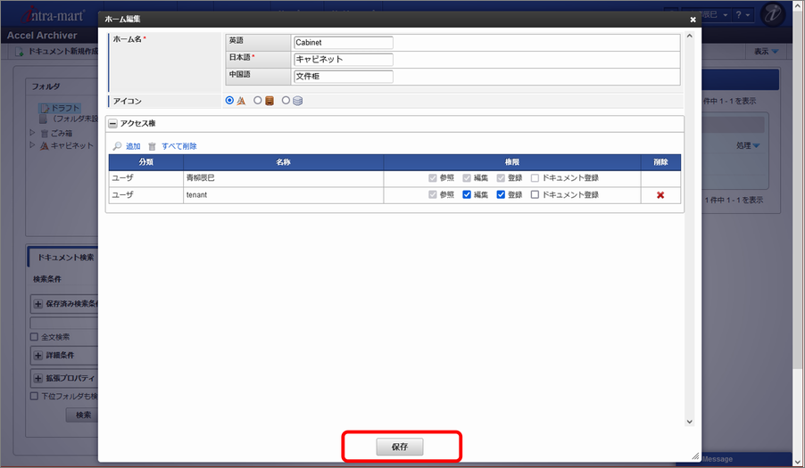 ホーム直下の第2層のフォルダを登録/編集します。 各ロケールのキャビネット/フォルダ名、アイコン、各ロケールの説明を選択して「保存」ボタンで登録します。