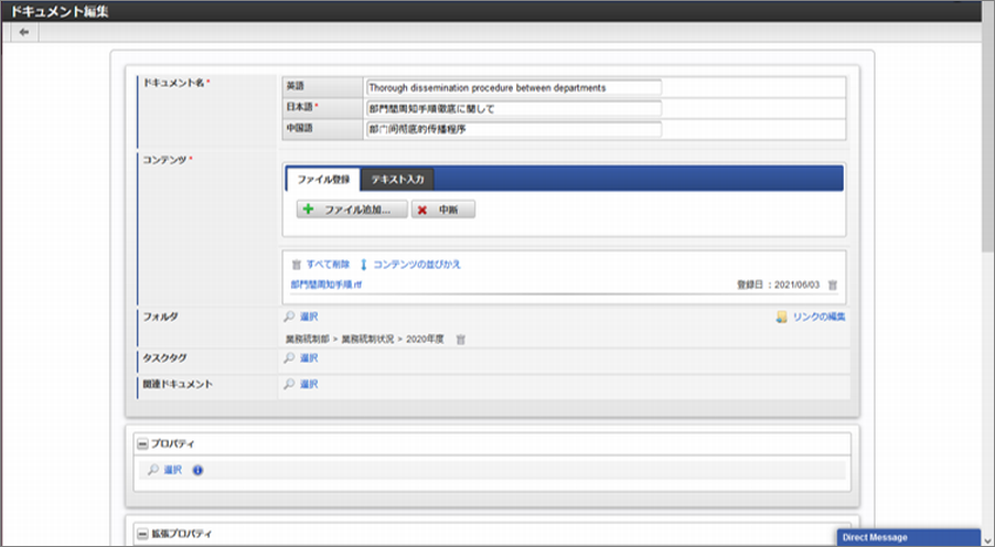 コラム ホーム/キャビネット/フォルダ/ドキュメント名の多言語化を有効にするには、「システム環境変数の変更」の「キャビネット名・フォルダ名・ドキュメント名の多言語設定利用」を参照してください。