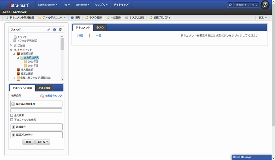 フォルダに大量のドキュメントが登録されている場合などの負荷軽減を図るため、フォルダクリック時、ドキュメントを初期表示しないモードを追加しました。ドキュメントを初期表示しないに設定している場合コラム