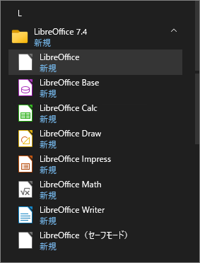 - Windowsのスタートメニューに「LibreOffice」のメニューが登録されていれば、正常にインストールが完了しています。