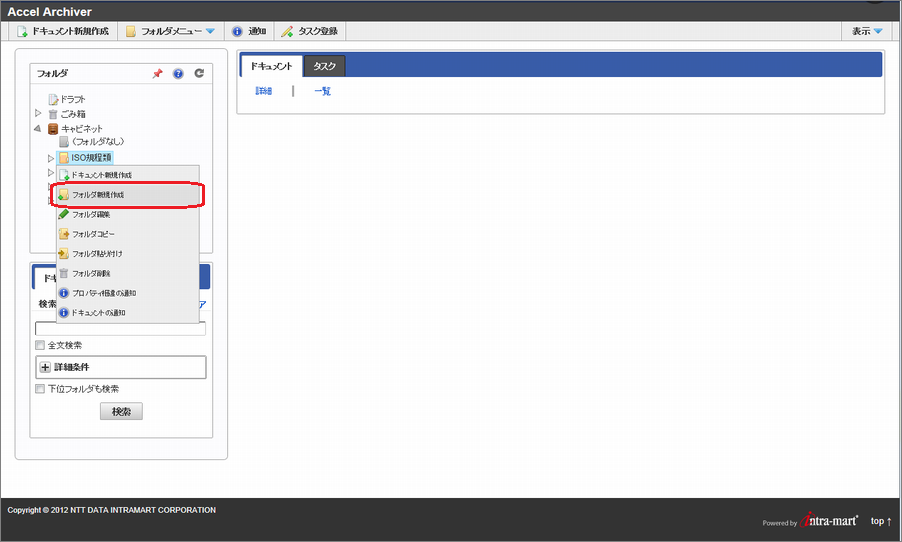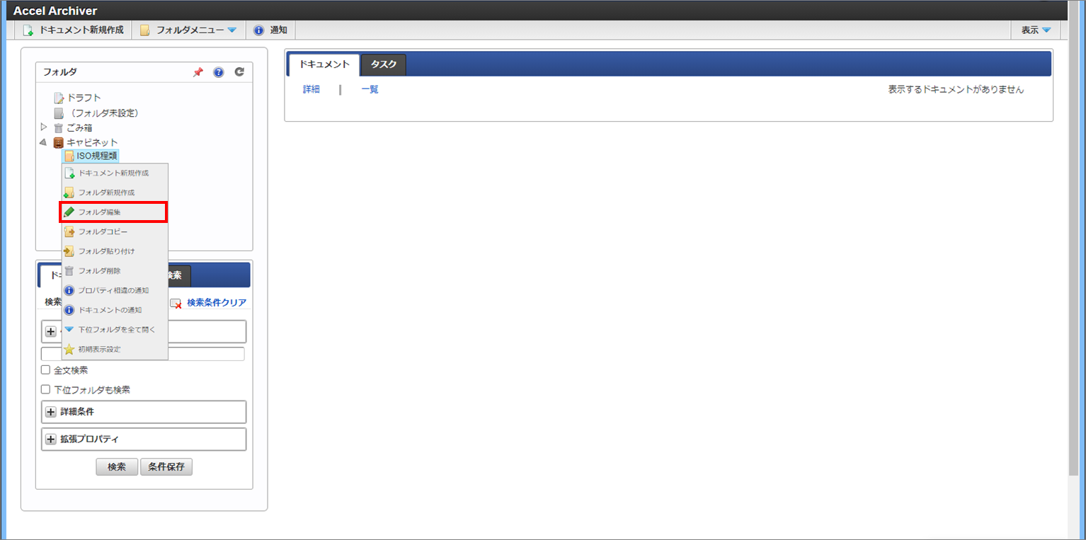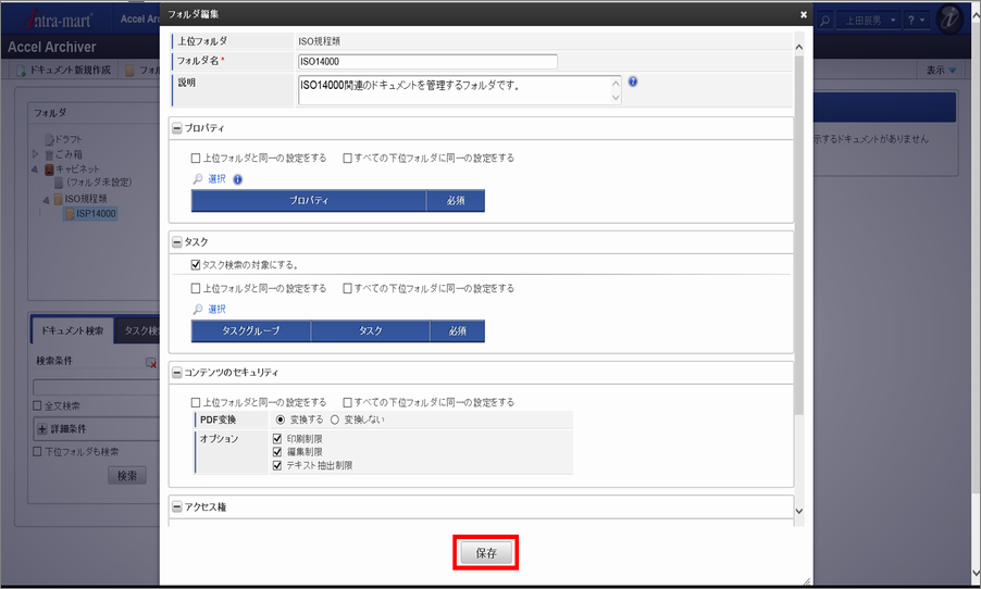 項目 説明 フォルダ名 フォルダの名称を入力します。 説明 フォルダの説明を入力します。入力した内容はドキュメント検索画面のフォルダツリー部分にカーソルをかざすと表示されます。 プロパティ プロパティの設定を行います。 拡張プロパティ 拡張プロパティの設定を行います。 タスク タスクの設定を行います。 コンテンツのセキュリティ コンテンツのセキュリティの設定を行います。 アクセス権 アクセス権の設定を行います。 「保存」ボタン フォルダを登録します。 コラム