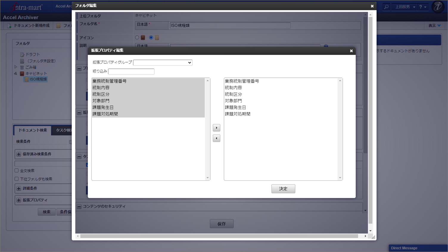 ・拡張プロパティ毎に必須の設定が可能です。・フォルダで必須設定した拡張プロパティはドキュメント登録時必須入力項目となります。