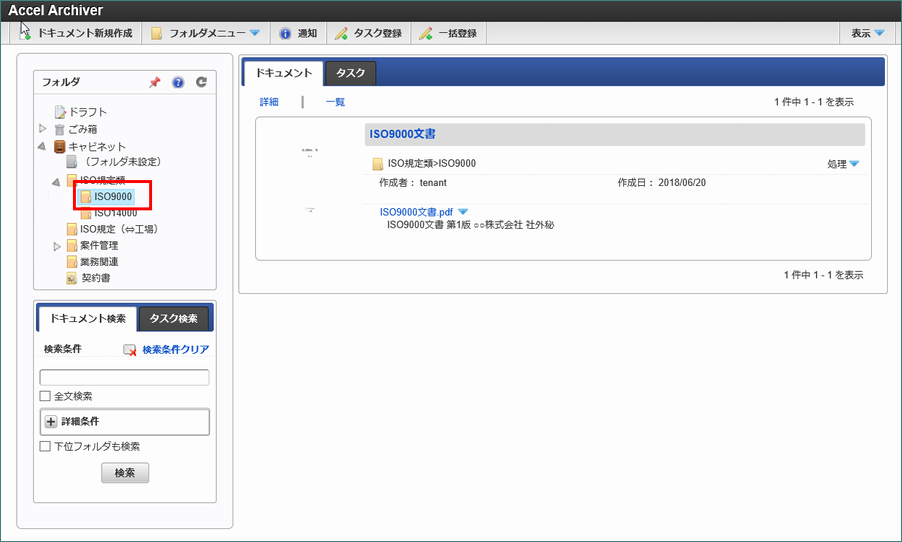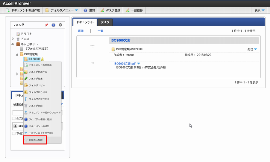 ログアウトし、再度ログインした後、intra-mart Accel Archiver のメニューをクリックすると、初期表示設定されたフォルダ内のドキュメントが初期表示されます。